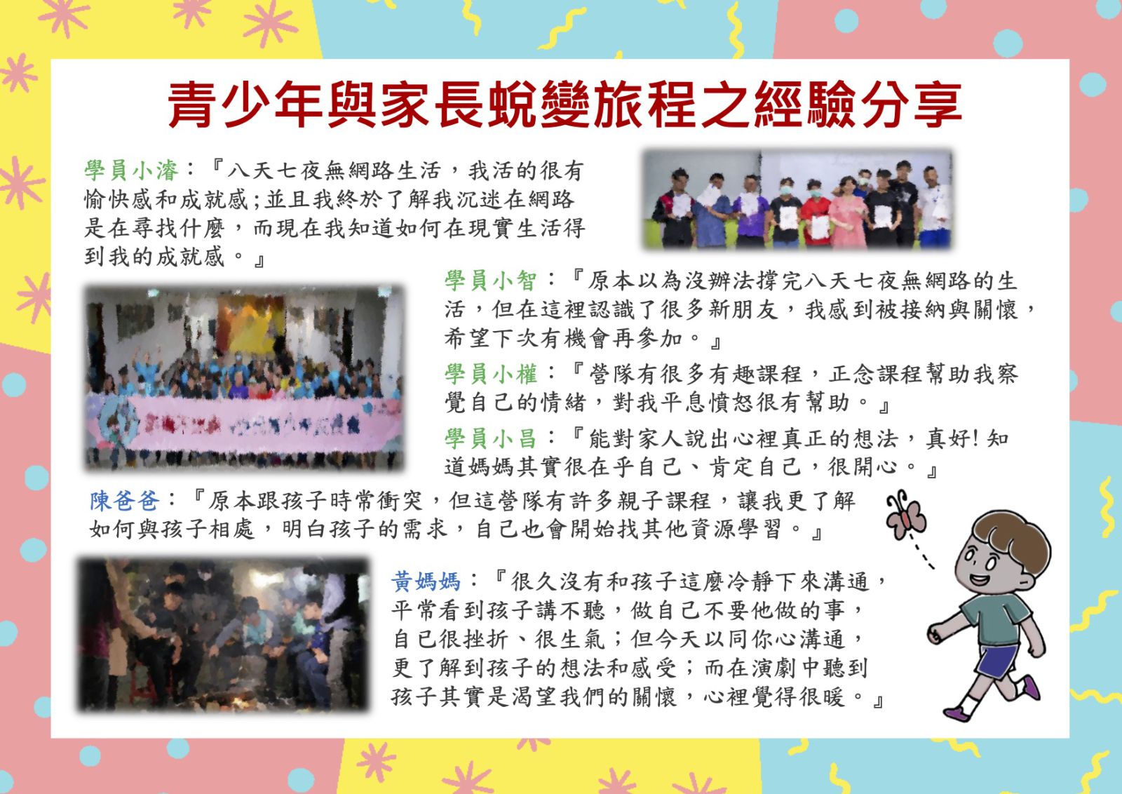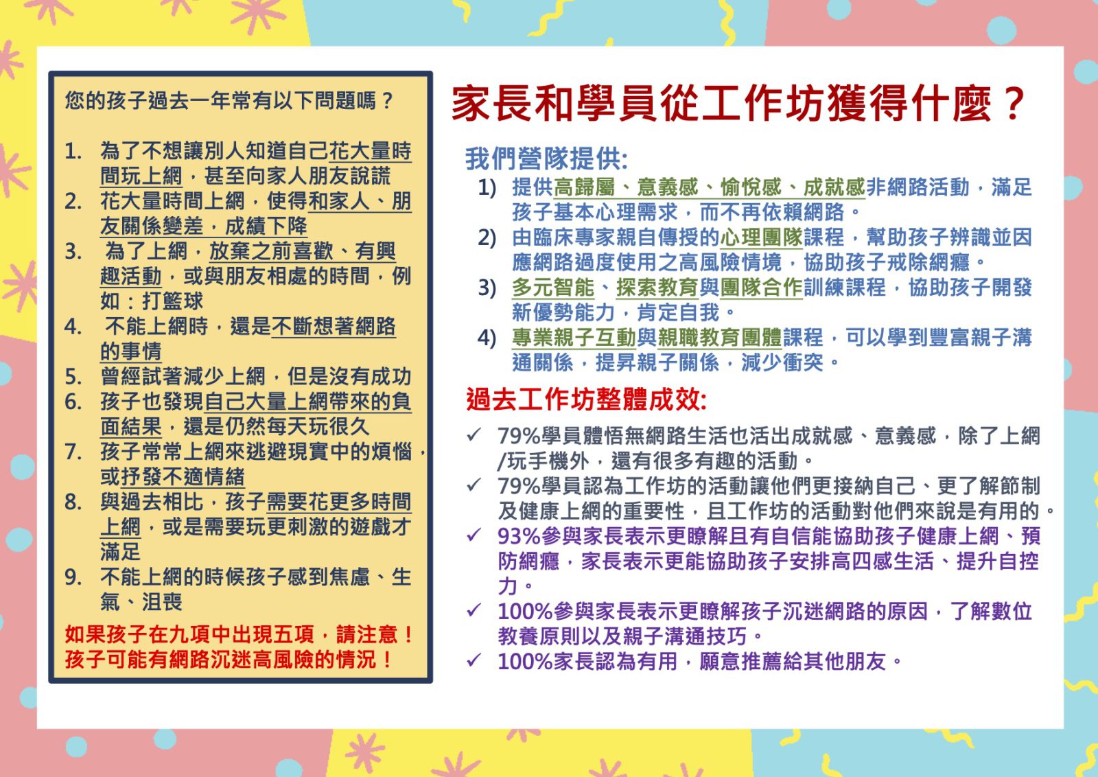 相信您為子女報名這工作坊,是「大愛」和「大智慧」的決定。本次工作坊是延續我們過去的無網路幸福不迷網營隊與工作坊豐富經驗——90%的學員參加後,網路沉迷現象改善,孩子們表達「八天七夜沒有網路,我活下來了,而且活得很快樂、很有成就感。」;並且,開始能夠健康上網,3C自控力提升,壓力管理、情緒管理的能力也提升了;100%家長反映,親子溝通也改善。因此,相信您和子女必能從此工作坊獲得成長和更多的幸福。展開奇妙的蛻變之旅。
