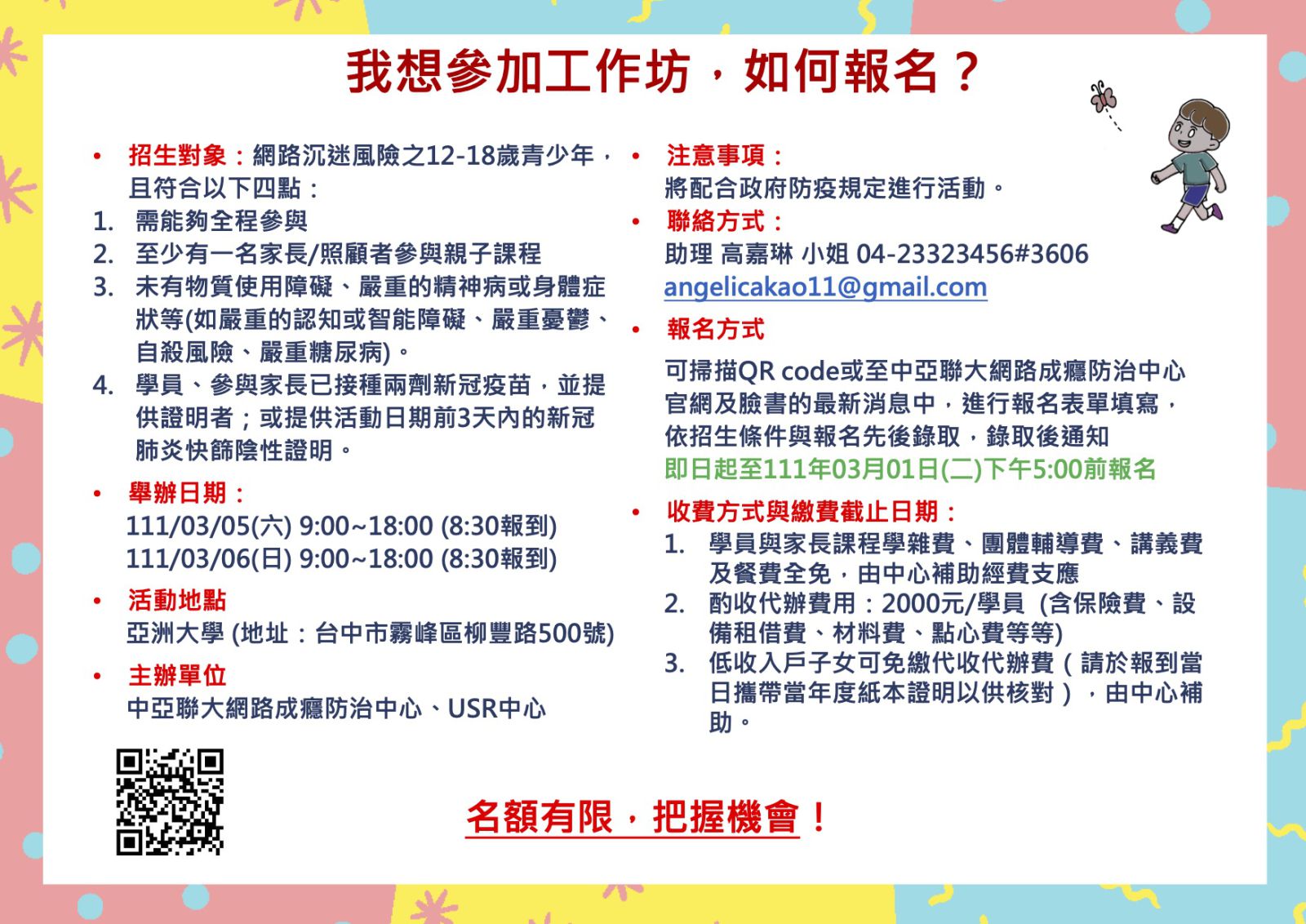2.報名方式:點進表單、掃描QR code或至中亞聯大網路成癮防治中心官網及臉書的最新消息中,進行報名表單的填寫。將依預定青少年學員及其家長名額、報名先後錄取與篩選標準決定錄取與否,並進行後續繳費及行前通知。