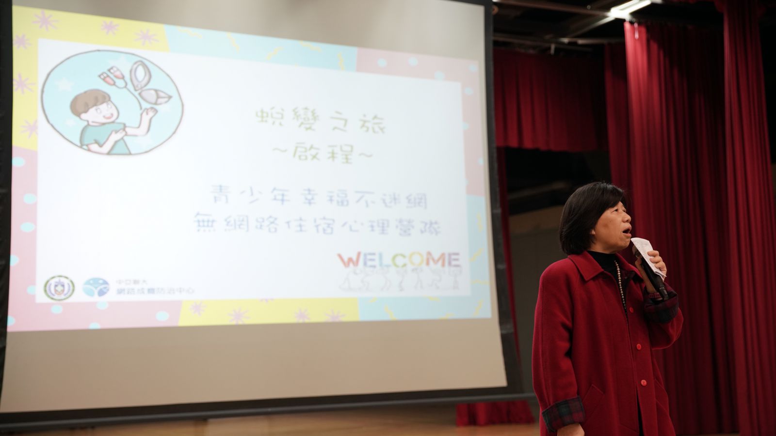 圖說:柯慧貞副校長為營隊啟程致詞分享,強調沒有網路的八天七夜營隊生活也能活出歸屬感、愉快感、成就感及意義感。
