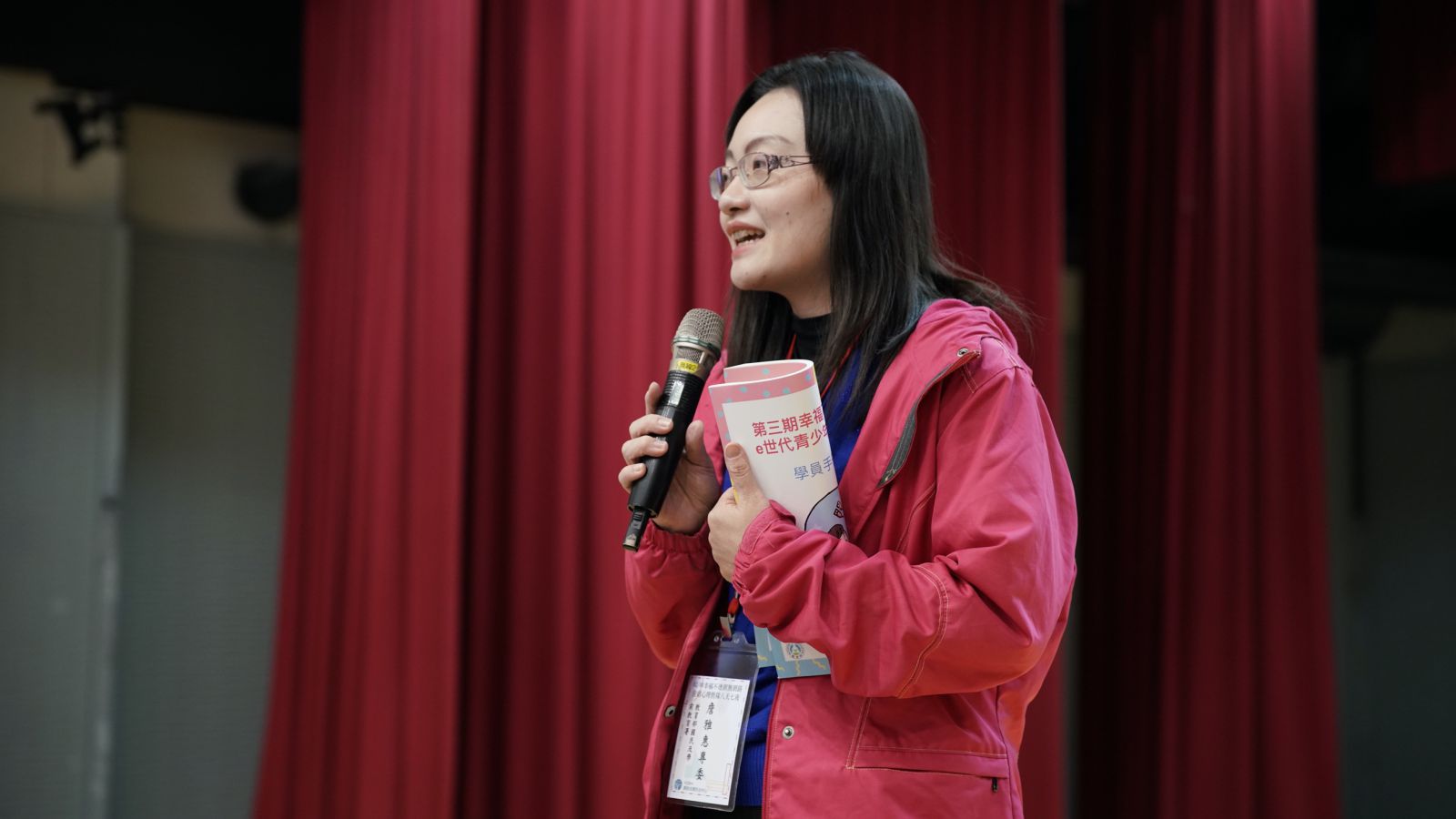 圖說:國教署詹雅惠專委致詞,分享手機在自己生活中的好壞處,期許所有參與的青少年將手機當作自己成長的工具,成為3C科技自主人!